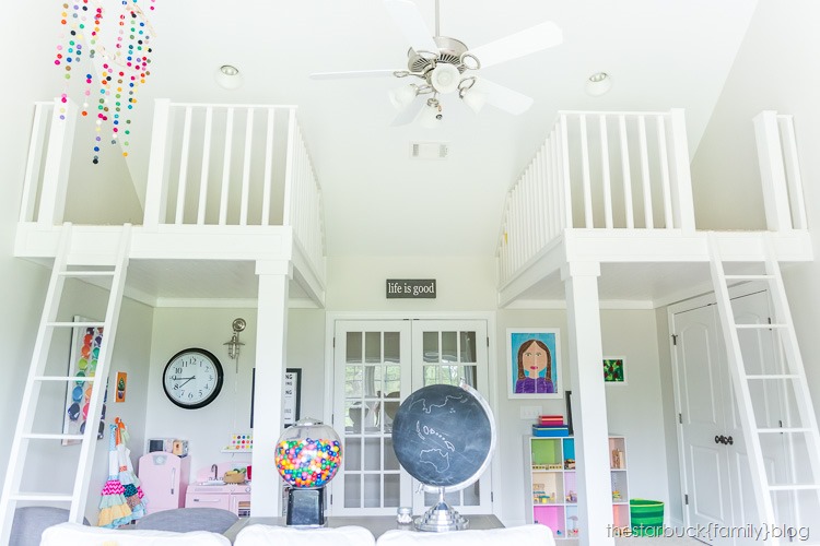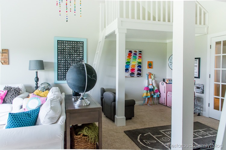 The truth is that we have been enjoying and loving this room for quite some time, but just as with any new baby-once they are here, everything else just kind of stops so you can enjoy just looking at them and cuddling them tight. Our sweet little Playroom baby has sure enjoyed all of our cuddling and loving on it for sure. So much in fact that it’s taken me forever to finally buckle down and take some pictures of it. Most days it is covered in toys. Pillows are thrown in piles for jumping. There are play restaurants daily serving their customers. American Girl dolls are living their little American dream in one of the lofts. And even though my rules dictate otherwise, there are a lot of days that I still manage to find some food snuck up here too.